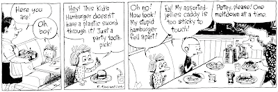 So a coupla years later I did another fridge cartoon. It got a little convoluted, though I like the final balloon. And I like the implication that the photograph is several rungs above the comic strip on the social ladder, and that the comic strip is a little wiseguy in a derby. I'd planned on doing some more chatty fridge-clutter cartoons; they're like those old animated cartoons from the 30s where all the books on the shelves would open up and the characters would spill out and do funny stuff. But they're hard to draw and to think up and I'm lazy. For some reason I have no trouble drawing most of your major appliances. Stoves, washers and dryers present no difficulties. But refrigerators defeat me.