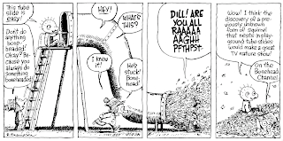 This follows nicely on Saturday's strip, which is pretty impressive as I drew the Sunday a month or so ago but only did the Saturday a few weeks back. And that's the only thing that's impressive about it really; the Sunday strip has a few good moments but it needs a stronger finish. Mr. Otterloop just didn't come through with a sharp enough zinger. But Petey's dense wad of foil makes me happy.